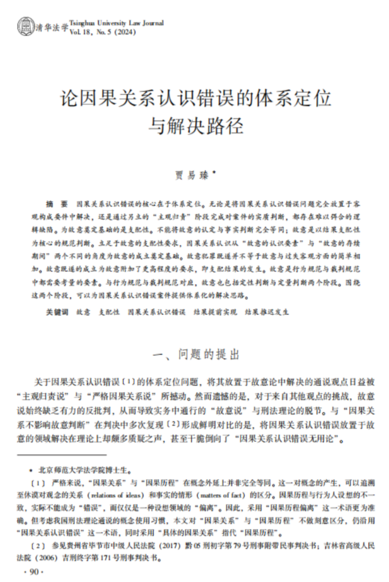The 5th issue of Tsinghua University Law Journal in 2024 published a paper by Jia Yizheng, a doctoral student in criminal law at the Law School of Beijing Normal University, entitled "On the Systematic Positioning and Solution Path of Misunderstanding of Causal Relationship". The paper argues that based on the dominant requirement of intent, intent is an element that needs to be considered in both behavioral norms and adjudication norms. Corresponding to behavioral norms and adjudication norms, intent also includes two stages: qualitative judgment and quantitative judgment. Based on these two stages, a systematic solution can be provided for cases of misunderstanding of causal relationships. It is reported that Jia Yizheng is a doctoral student at the Class of 2022 of the Law School of Beijing Normal University, mentored by Professor Huang Xiaoliang, and his research direction is criminal law. In recent years, the Law School of Beijing Normal University has held a series of activities such as the "National Doctoral Student Forum in Criminal Law", "BNU Doctoral Student Forum in Law", and "BNU Legal Graduate Salon", inviting young scholars and senior experts to communicate and discuss with master's and doctoral students, effectively improving the academic research and paper writing capabilities of graduate students.