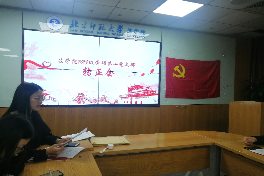 会议开始,支部书记任和和介绍了转正大会的注意事项和流程。第一项是预备党员转正大会。首先,全体起立,面向党旗,奏唱国际歌。