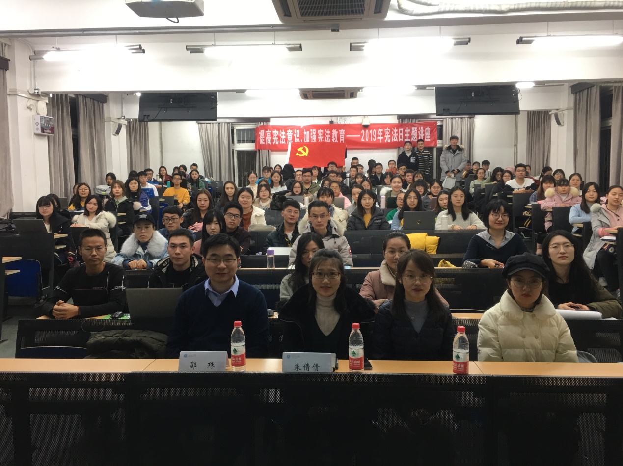 为深入贯彻习近平总书记关于加强宪法学习宣传教育的重要指示精神,贯彻落实党中央学习宪法的有关精神,2019年12月4日,少妇色情 邀请到研究宪法学与行政法学的郭殊老师于教四101教室为各院师生开展主题为《提高宪法意识,加强宪法教育》的讲座。参与本场讲座的师生有:党委学工部学生党建与思想政治教育处的朱倩倩老师、少妇色情 团委书记马丽亚老师以及各院学生。2019级法律硕士第二党支部组织党员和入党积极分子参加本次学习。
