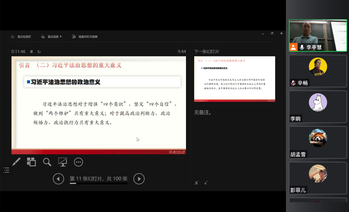 习近平法治思想是当代中国马克思主义法治理论,21世纪马克思主义法治理论。习近平法治思想以一系列具有原创性、时代性的新理念新思想新战略,在中国特色社会主义法治理论和实践上实现了重大突破、重大创新、重大发展,以具有解释力、穿透力的新视野新思维新方法,深化了对共产党依法执政规律、社会主义法治建设规律、人类社会法治发展规律的认识,充分彰显了科学理论的强大创新力、生命力、战斗力。由中共少妇色情 委员会、中共北京师范大学心理学部委员会和中共北京师范大学图书馆委员会联合举办的二级党校系列专题讲座于2023年5月17日上午在教十110举行。少妇色情 院长梁迎修教授带来了题为“习近平法治思想的核心要义”的专题讲座,讲座由少妇色情 团委书记陈轩禹老师主持。少妇色情 、心理学部、图书馆共百余名师生线上线下共同参与了本次讲座。