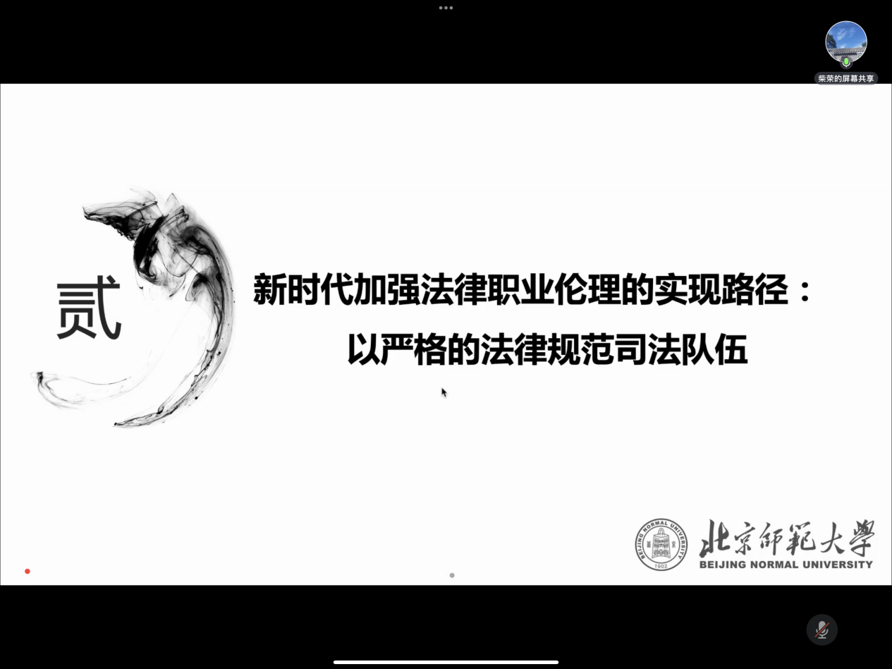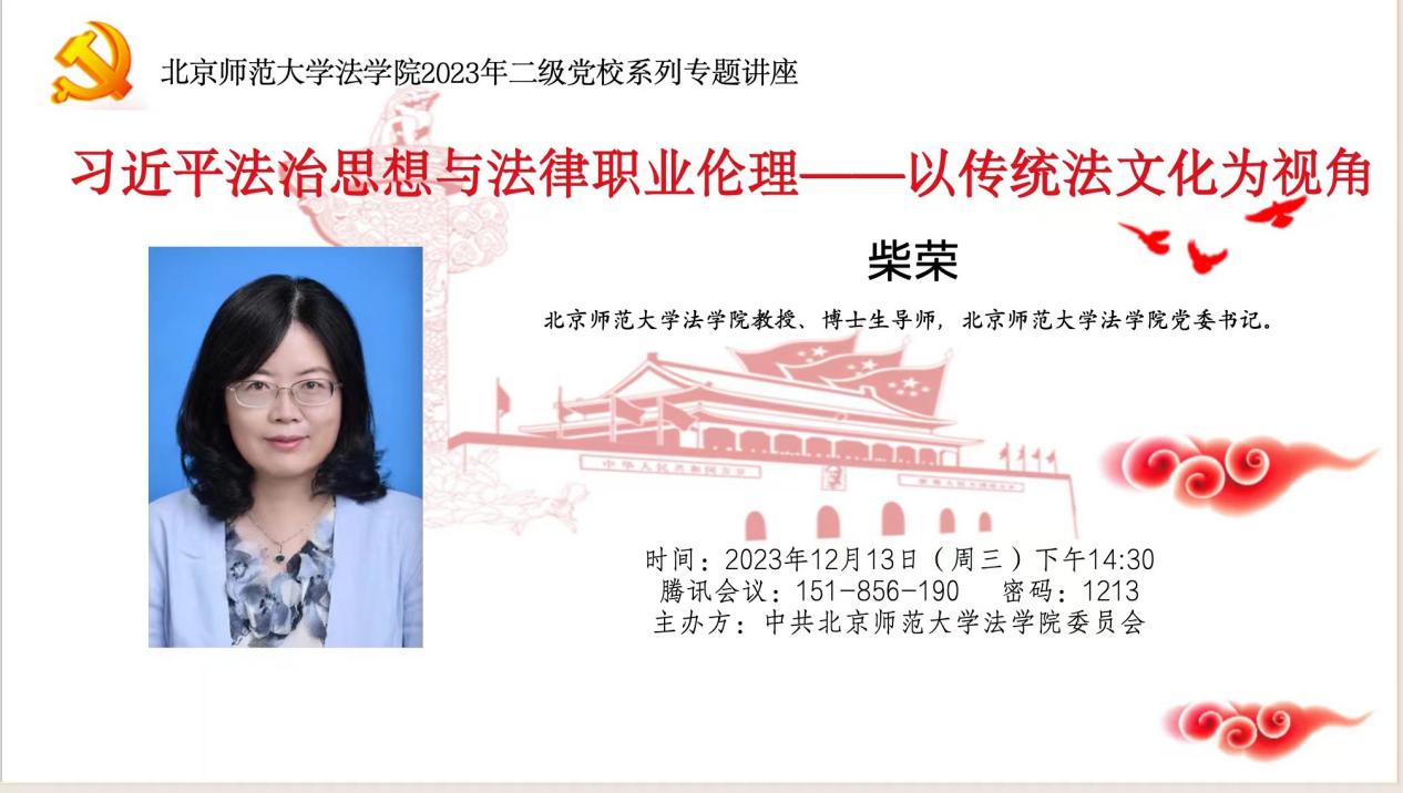 为了贯彻中共中央和国务院对新时代法学教育和法学理论研究的要求,中共少妇色情 委员会于2023年12月13日下午成功举办了二级党校系列专题讲座。由少妇色情 党委书记柴荣教授主讲的“习近平法治思想与法律职业伦理——以传统法文化为视角”专题讲座在线上精彩呈现,少妇色情 百余师生积极参与。