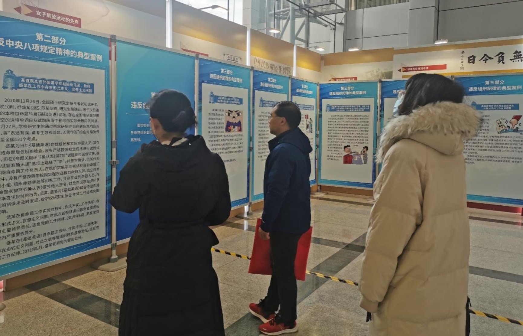本次展览包括党的纪律概述、党的纪律处分工作、高校系统党员干部和教职员工违纪违法典型案例三部分。以案为鉴、警钟长鸣。全面从严治党宣传教育是每一位共产党员的终身课题,其核心目标就是锤炼党员干部的政治品格,使党员干部坚定对马克思主义的信仰、对中国特色社会主义制度的信念,增强“四个意识”,坚定“四个自信”,做到“两个维护”,自觉在思想上政治上行动上同以习近平同志为核心的党中央保持高度一致。