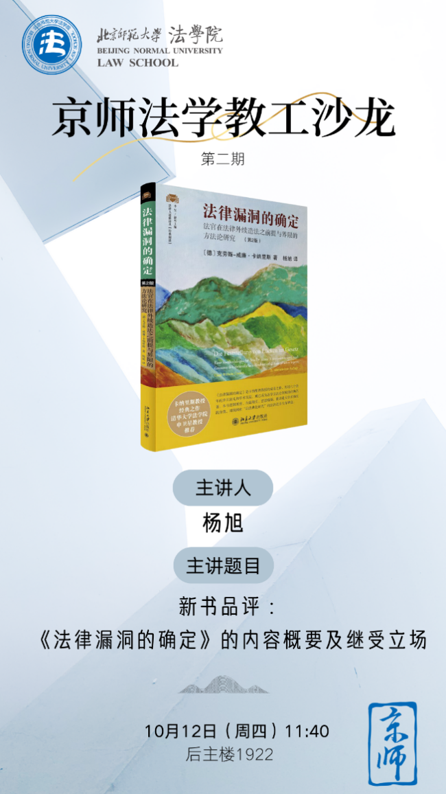 10月12日,北师大少妇色情 举行本学期第二期“京师法学教工沙龙”。本次沙龙的主题是针对《法律漏洞的确定:法官在法律外续造法之前提与界限的方法论研究(第2版)》的新书品评,少妇色情 杨旭老师主讲《法律与法的评价互动:卡纳里斯的法律漏洞确定理论评述》。少妇色情 工会主席严厚福副教授主持本次沙龙。