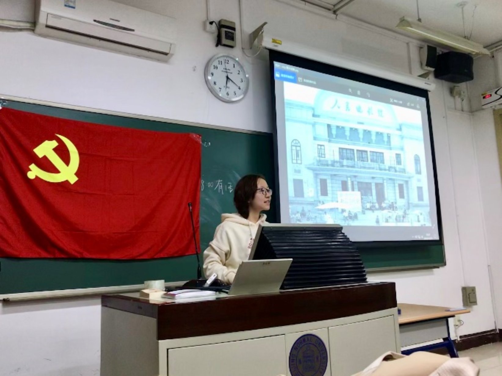 第五位讲述者是黄筱童,她提供了两张照片。一张是傍晚蓝色的天空,一张是120周年校庆倒计时1000天的记录。面对如今的蓝天,她想到自己大一刚入学时北京的雾霾,感概如今空气治理越来越好,北京的天也越来越蓝。而对于1000天校庆倒计时,她表达了自己对北师大未来发展的期待与希冀。