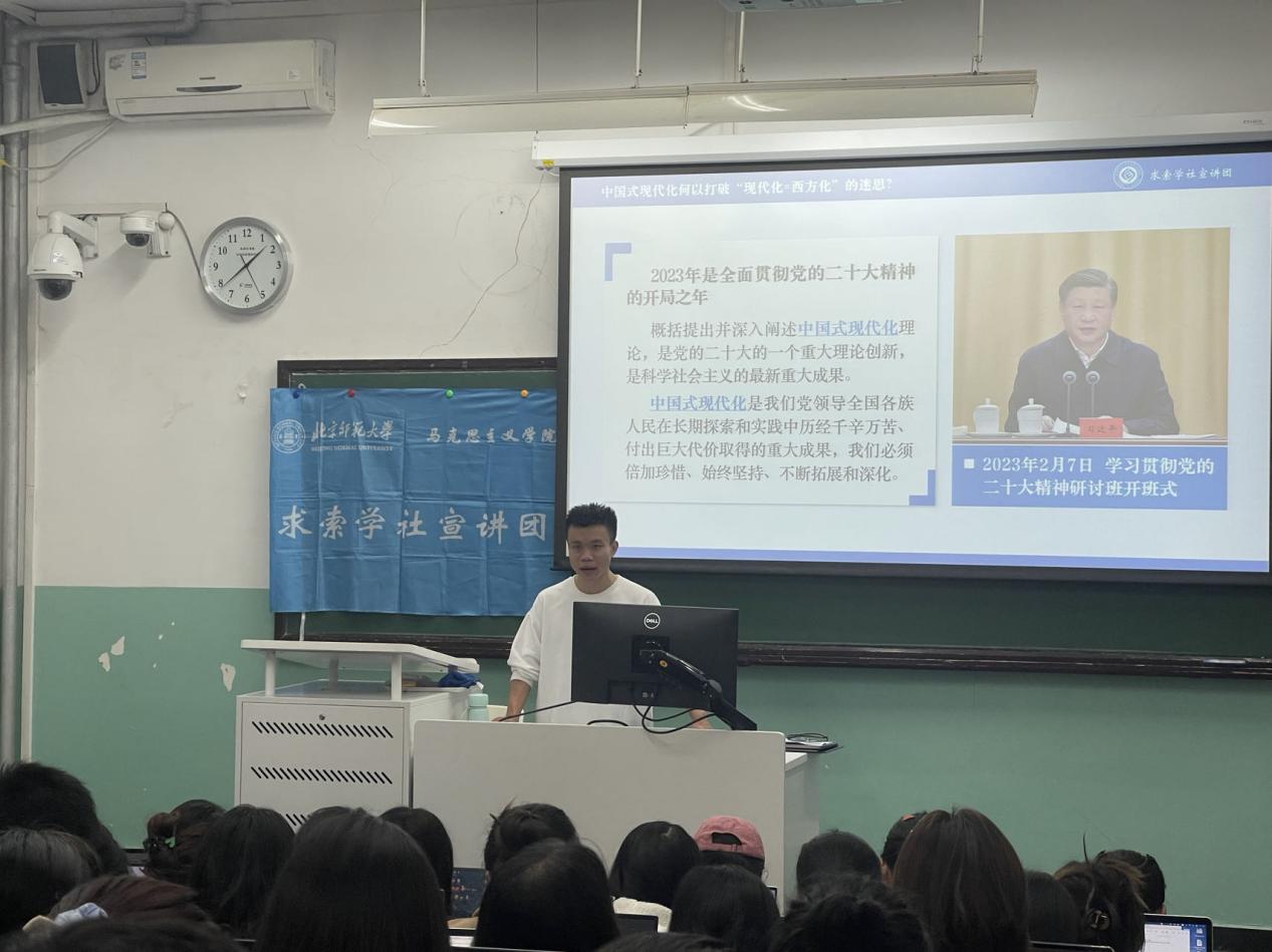 10月25日,少妇色情 入党积极分子培训暨二级党校举办了主题为“中国式现代化何以打破‘现代化=西方化’的迷思?”的专题讲座。讲座特邀了北京师范大学马克思主义学院求索学社宣讲团的陈正同学担任主讲人,共有90余名少妇色情 学生党员和入党积极分子参与。