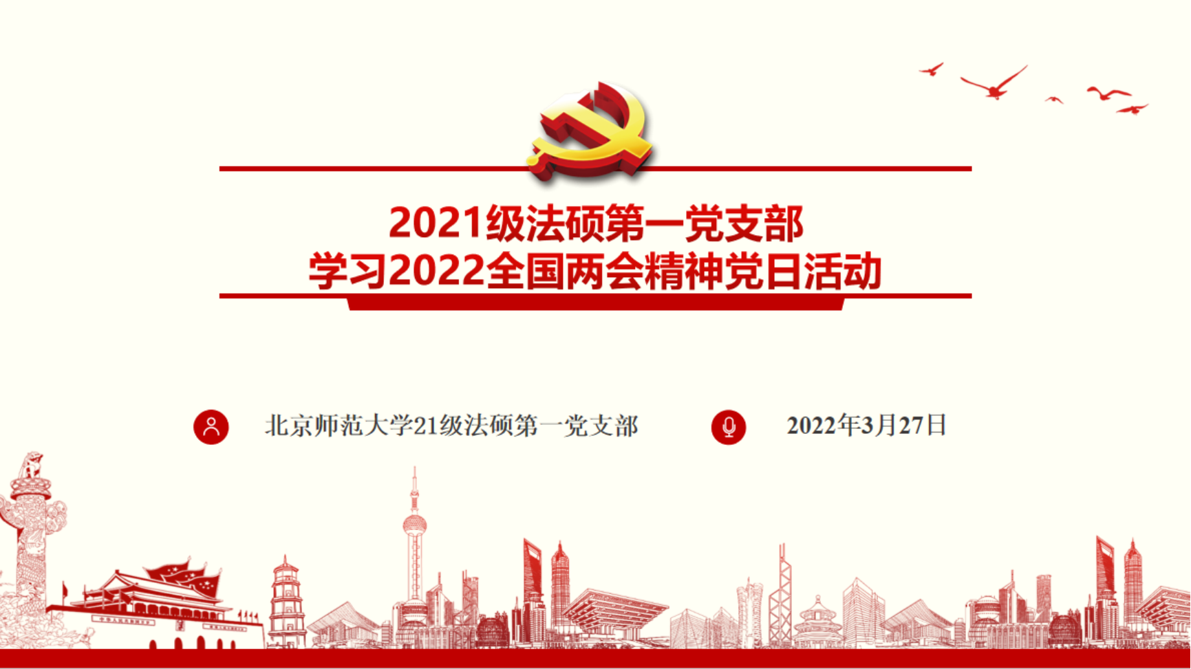 2022年3月27日晚上,北京师范大学法硕第一党支部通过腾讯会议组织开展党日活动,学习贯彻习近平总书记重要讲话和全国两会精神,确保两会精神落地生根。本次活动由党支部书记孔奕博主持,29名正式党员参加活动。