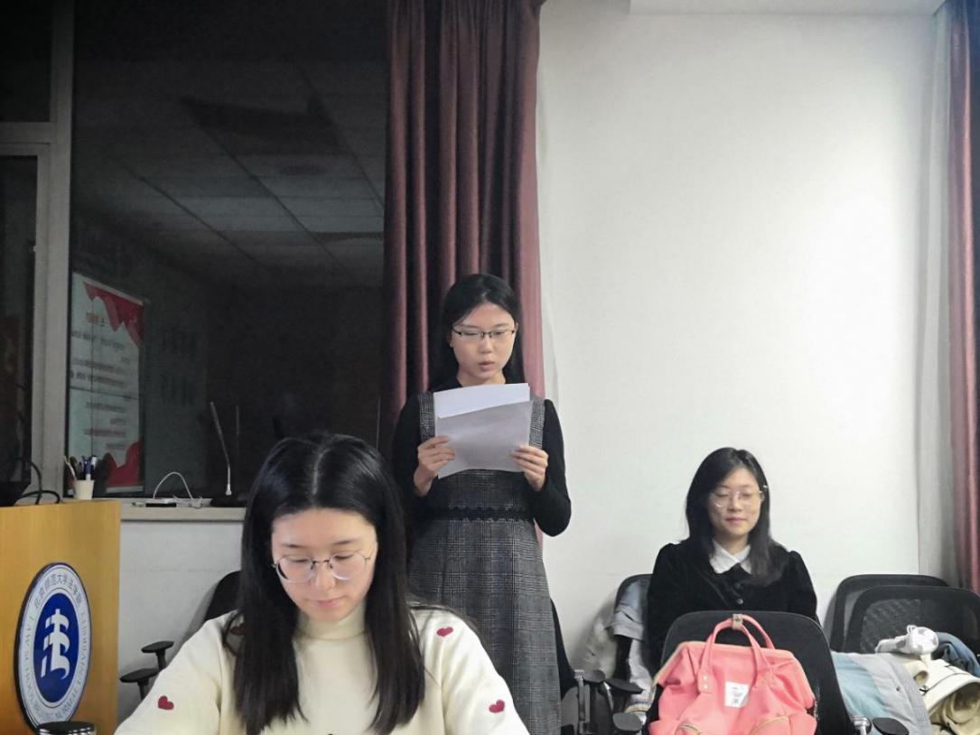 会议伊始,全体起立,面向党旗奏唱国际歌。由支部书记介绍出席会议的人员情况和拟接受预备党员的基本情况,并进入正式发展流程。首先,发展对象宣读了《入党志愿书》,汇报入党动机、对党的认识、本人履历及需向党组织说明的问题等,随后入党介绍人分别介绍了发展对象的有关情况及对其入党的意见,支委会向大会报告对发展对象的审议情况。经过支部大会针对发展对象逐个进行认真、充分的讨论和无记名投票表决,认为于秋实同志、马青琳同志已具备党员基本条件,到会有表决权的党员全票通过,同意接收于秋实同志、马青琳同志为中共预备党员。