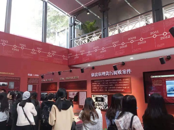 在讲解员的引导下,同学们首先进入了“人民法院七十年成就展”。这个展厅展示了许多珍贵文物和人民法院审判的重要案件,如:炮轰天安门案、新中国反贪第一大案等。这幅气势恢宏的历史长卷,让同学们了解了建国70周年以来人民法院在党的领导下走过的光辉历程,也认识到了法律对于我国经济建设和社会发展所起的重要作用。