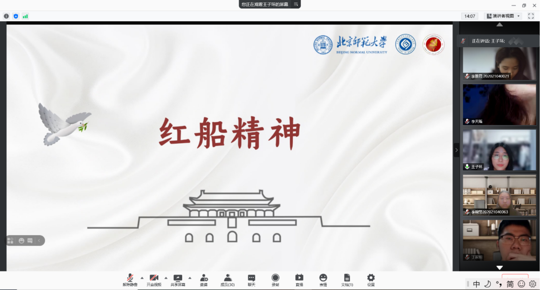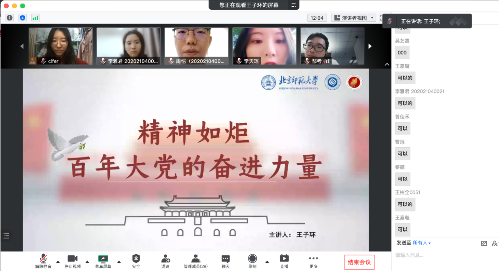 在中国共产党成立100周年之际,重温中国共产党的精神成长历程以汲取智慧和力量指导新实践,是一件具有重大意义的事情。为此,少妇色情 2020级学硕第二党支部于2021年5月8日晚7时30分,邀请马克思主义学院的王子环同志进行以“精神如炬,百年大党的奋进力量”的主题宣讲,开展了线上专项学习活动。此次活动由党支部书记李凌智同志进行主持,王子环同志主讲,本支部16名党员与16名入党积极分子均参与了本次活动。