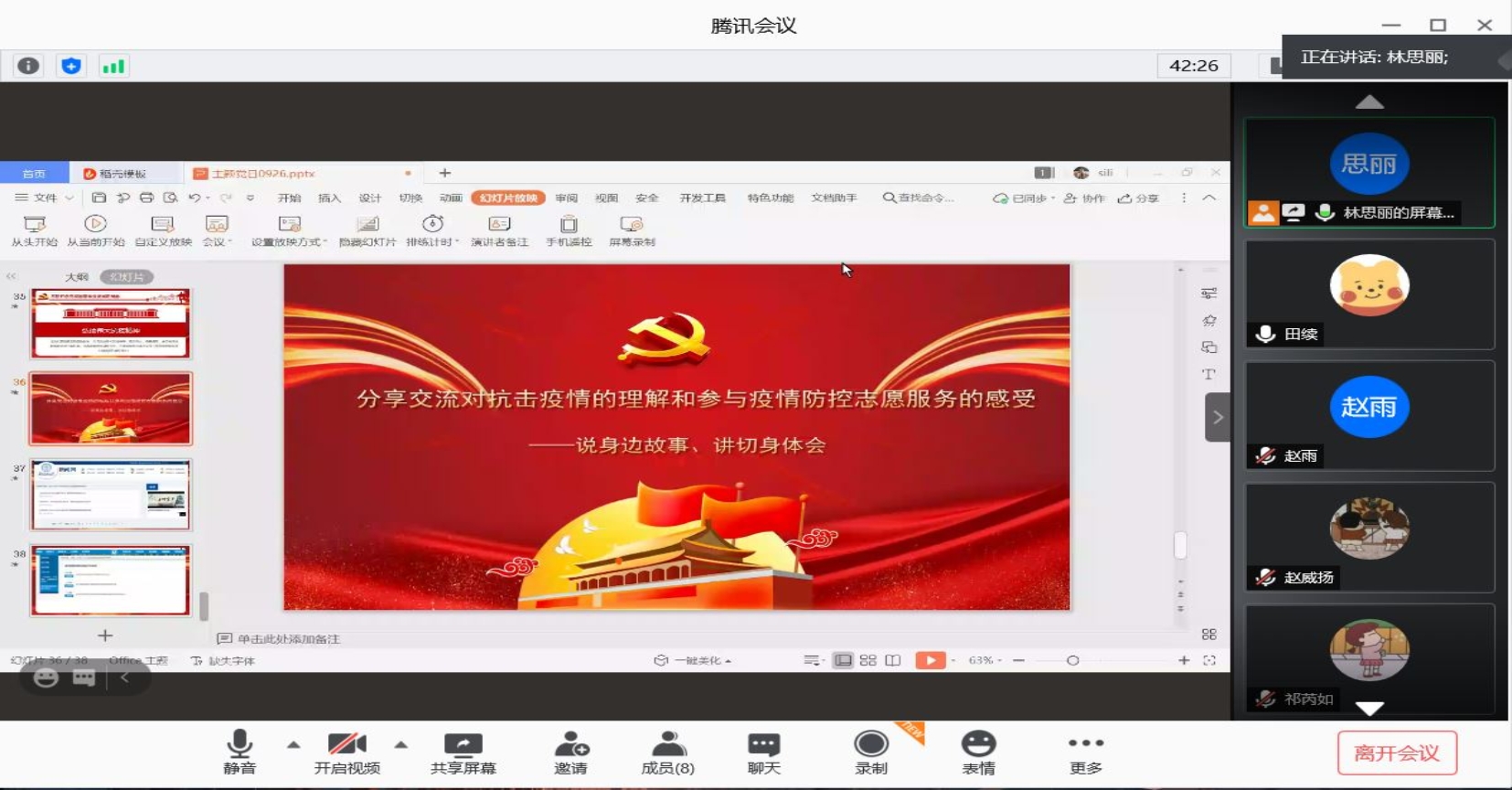 林思丽同志率先发言,她说:“在疫情期间,我于4月-7月在校工作,看到学校、社区所做的扎扎实实的疫情防控工作,感到非常踏实而幸福。而这种安全感从疫情之初一直延续到现在,这份安全感的背后,是千千万万医务人员“白衣为甲、逆行出征”、是全中国人民“风雨同舟、众志成城”、是党中央“统揽全局、果断决策,以非常之举应对非常之事”……我不禁为自己生长在这样一个伟大的国家而感到骄傲、自豪!”