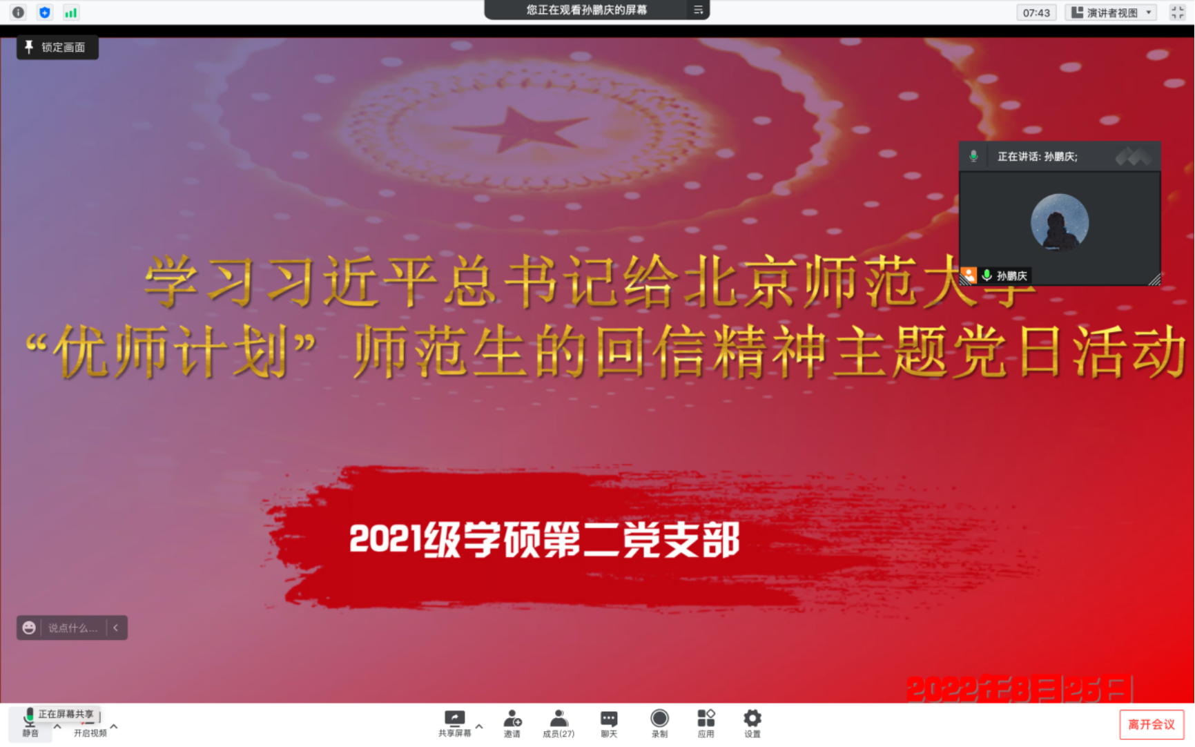2022年9月16日晚19:00,2021级学硕第二党支部“筑牢理想信念,践行使命担当”主题党日活动正式召开,本次活动以线上腾讯会议的方式进行,由党支部书记介绍活动概况,支部同志共同学习习近平总书记给北京师范大学“优师计划”师范生的回信内容并发表感想。本次活动由2021级学硕第二党支部书记孙鹏庆主持,支部共计29人参加本次活动。