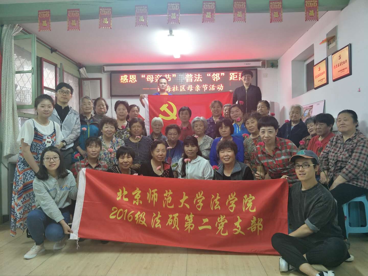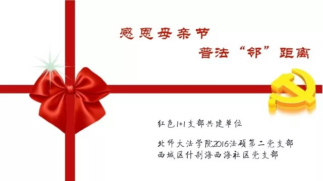 5月的第二个周日,是一个充满温情与感恩的日子-母亲节。为响应北京高校红色“1+1”活动,2016级法律硕士第二党支部深入基层,服务群众。2018年5月11日,值母亲节来临之际,联合北京市西城区什刹海西海社区党支部,开展感恩母亲节,普法“邻”距离活动。营造浓厚的法律法规宣传氛围,增强居民依法维权的法律意识。