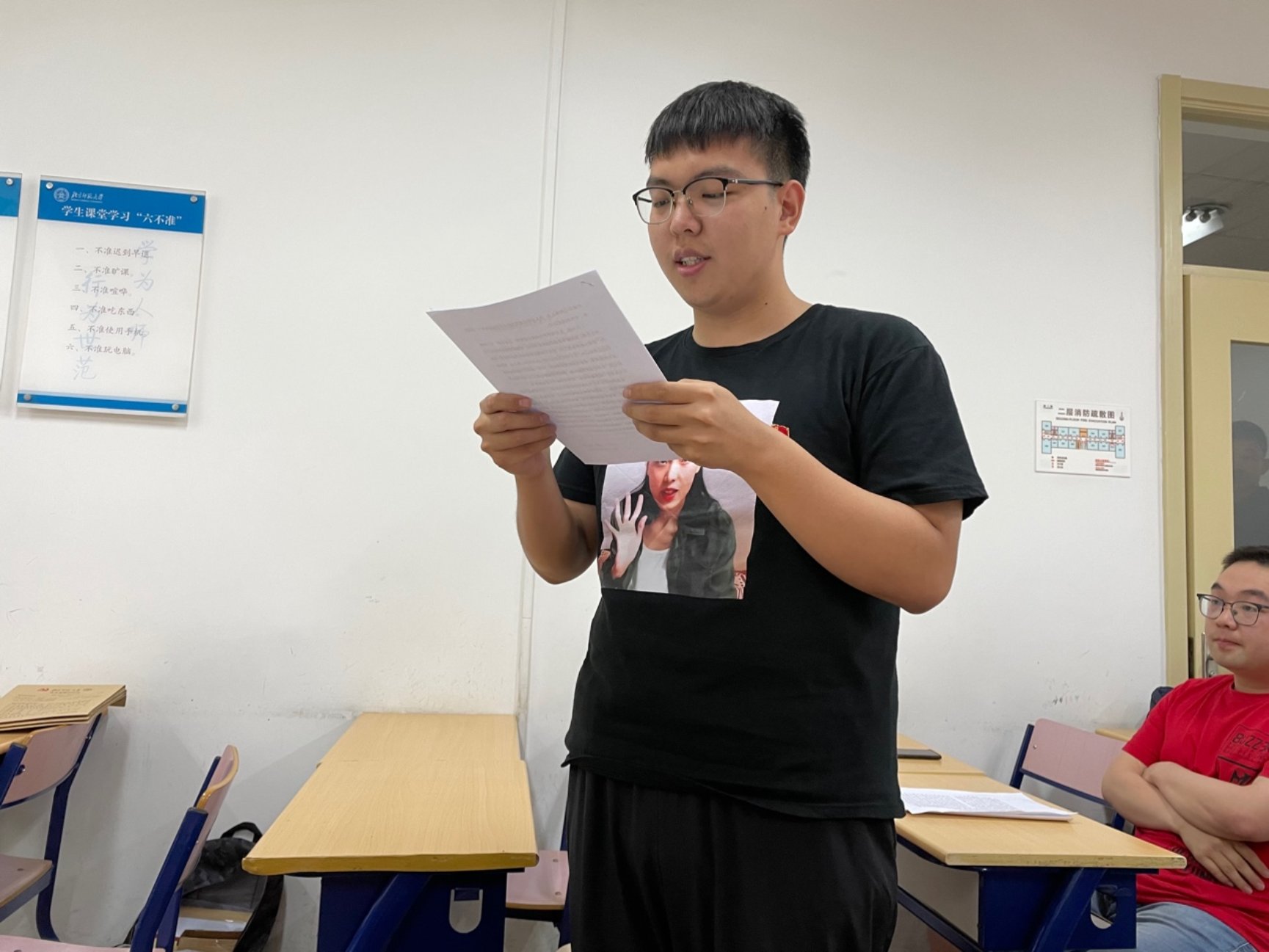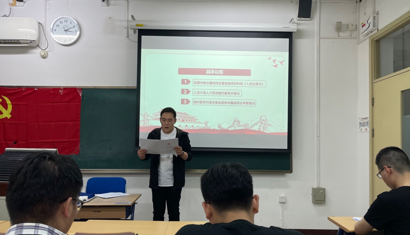 接下来,大会进入具体议程。首先大会就接收孙墨成同学作为预备党员进行讨论。由孙墨成同学宣读其《入党志愿书》,汇报个人对党的认识、入党动机、家庭和社会关系等情况。孙墨成表示其从小就听长辈讲述老一辈革命家的英雄事迹,早早在心中树立起加入中国共产党的伟大理想。在2020年新冠疫情爆发期间,他自愿加入社区志愿者队伍,为来往居民测体温、做登记,不辞辛苦,毫无怨言。