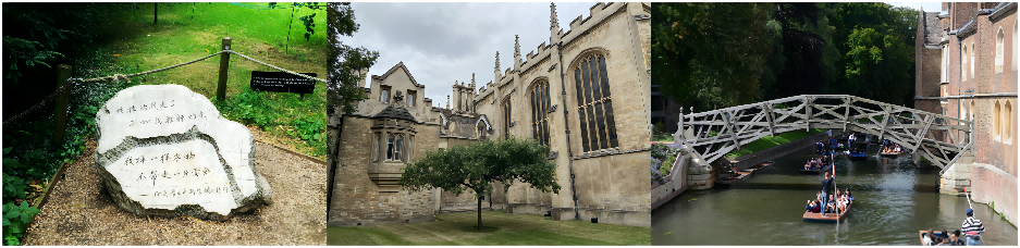 对剑桥大学学院的参观之旅(College Tour)是在剑桥大学导行老师的带领下,依次游览了由英王亨利六世创建、因中国著名诗人徐志摩的石碑而让国人心向往之的国王学院(King’s College);剑桥大学中规模最大、名声最响的学院之一,著名的“牛顿苹果树”也生长于此的三一学院(Trinity College);有着象征时光易逝、生命无常的圣体钟(Corpus Clock)的基督圣体学院(Corpus Christi College);走出了如麦克斯韦、瑞利、汤姆逊、卢瑟福、布拉格等一批又一批蜚声世界的科学家被誉为“诺贝尔科学奖的孵化器”的卡文迪许实验室(Cavendish Laboratory)。此外,在剑桥大学的导行老师带领下,也游览了风景秀丽的卡姆河、横跨皇后学院(Queen’s College)的牛顿之桥——数学桥(Mathematical Bridge)、神圣庄严的Chaple、以及富含自然与历史气息的Zoology Museum。参访了大圣玛丽教堂(Great St. Mary’s Church)和城堡山(Castle Hill)。