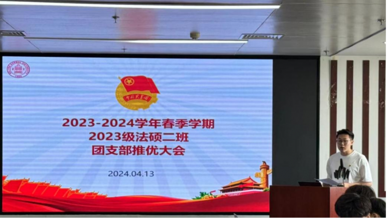2024年4月13日下午1点30分,在2023级法律硕士二班团支部委员会的组织下,入党推优大会在后主楼1822成功召开。团委组织部委员李金泽作为监票人出席,本次大会由团支书梅笑宇同学主持。
