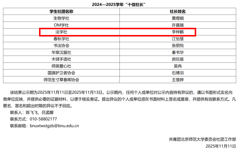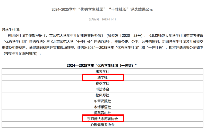 2025年10月,校团委社团工作部根据《北京师范大学学生社团建设管理办法》《北京师范大学“优秀社团”评选标准》,组织各学生社团进行评比活动。我院共有两个社团——北京师范大学法学社与京师普法志愿者协会从102个社团中脱颖而出,均荣获2024-2025年度“优秀学生社团(一等奖)”,同时法学社社长李梓鹤荣获“十佳社长”称号。其中,北京师范大学法学社连续23年获得“双十佳”称号。