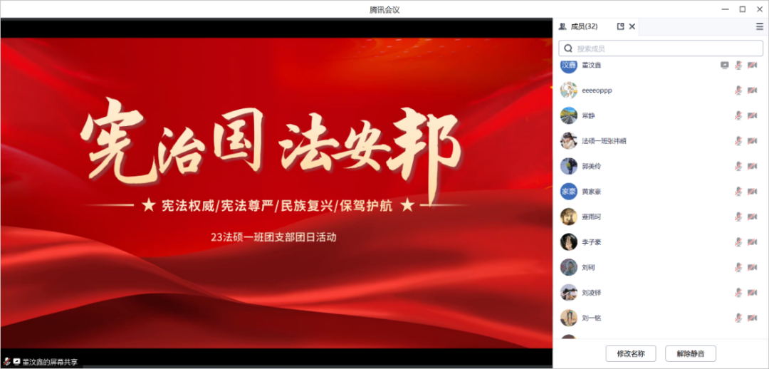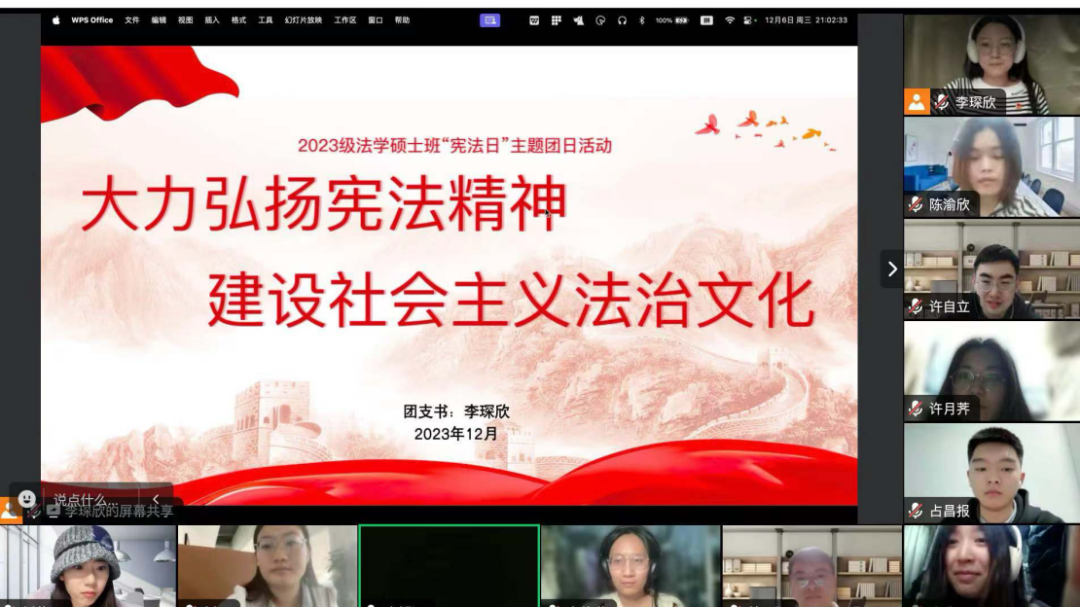 为深入学习贯彻习近平总书记关于宪法的重要讲话精神,增强广大青年学生的宪法意识,2023年12月7日,少妇色情 博士生团支部在线上举办“弘扬宪法精神,维护宪法权威”宪法日主题团日活动,引导广大青年学生自觉成为宪法的忠实崇尚者,自觉遵守者,坚定捍卫者,为中国特色社会主义法治发展注入青年力量。博学笃行,执法治利刃。刚健中正,扬法治荣光。宪法是国家的根本大法,是治国安邦的总章程,始终把遵守宪法法律放在第一位,是每个人都应该遵守的行为准则。本次主题团日的顺利开展增强了博士生团支部的青年学子对宪法的认识和对法律的尊崇,营造了尊法、学法、守法、用法的氛围,为今后弘扬宪法精神,树立宪法权威打下了坚实的基础。