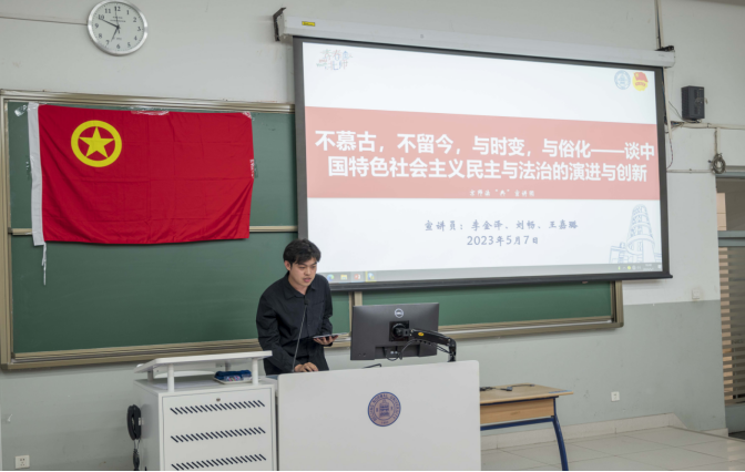 李金泽、刘畅、王嘉璐三位宣讲团成员以“不慕古,不留今,与时变,与俗化——谈中国特色社会主义民主与法治的演进与创新”为宣讲主题,分别从“历经沉淀的中国智慧:党史中的民主理论”“民主之问的中国答案:全过程人民民主的理论”“人民当家作主的中国方案:全过程人民民主的生动实践”三个维度展开阐述。