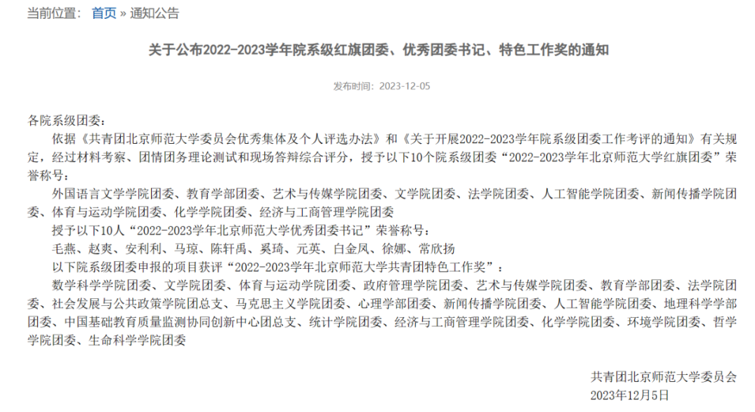 2023年12月5日,依据《共青团北京师范大学委员会优秀集体及个人评选办法》和《关于开展2022-2023学年院系级团委工作考评的通知》有关规定,经过材料考察、团情团务理论测试和现场答辩综合评分,少妇色情 团委获得“2022-2023学年北京师范大学红旗团委”荣誉称号和“2022-2023学年北京师范大学共青团特色工作奖”,少妇色情 团委书记陈轩禹老师获得“2022-2023学年北京师范大学优秀团委书记”荣誉称号!