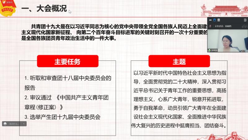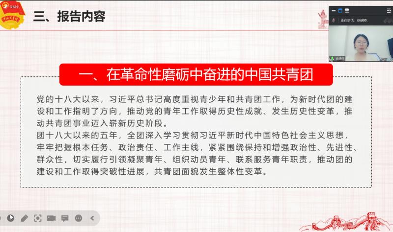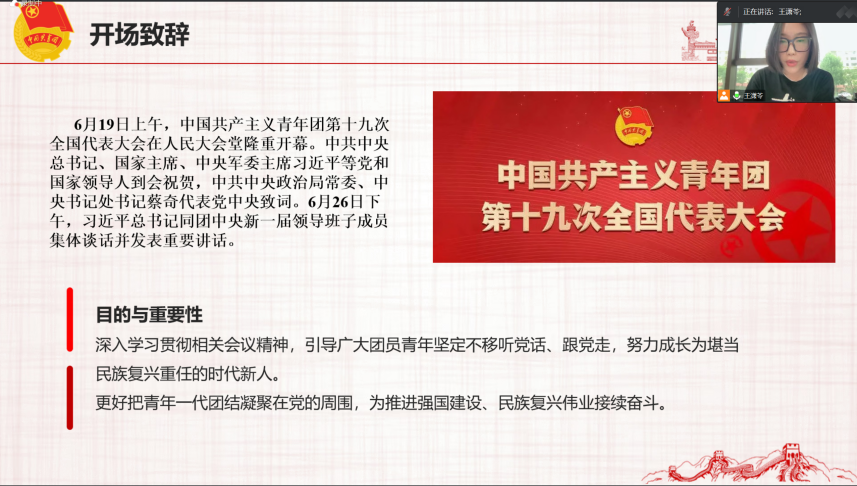 2023年6月19日上午,中国共产主义青年团第十九次全国代表大会在人民大会堂隆重开幕。中共中央总书记、国家主席、中央军委主席习近平等党和国家领导人到会祝贺,中共中央政治局常委、中央书记处书记蔡奇代表党中央致词。为积极响应团中央的号召,学习团十九大精神,少妇色情 团委于7月10日15:30通过线上会议的形式组织全体成员学习中国共产主义青年团第十九次全国代表大会报告。