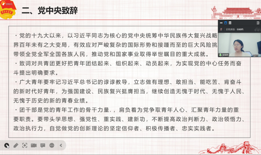 最后,学习团十九大报告的主要内容。中国共产主义青年团第十九次全国代表大会报告全面总结了在以习近平同志为核心的党中央坚强领导下共青团过去五年的工作,阐明了新时代中国青年的使命担当,强调了新时代共青团工作的根本遵循,对未来五年共青团建设和工作作出部署,充分体现了党的要求、反映了青年期望,是当前和今后一个时期共青团工作的重要指导性文件。