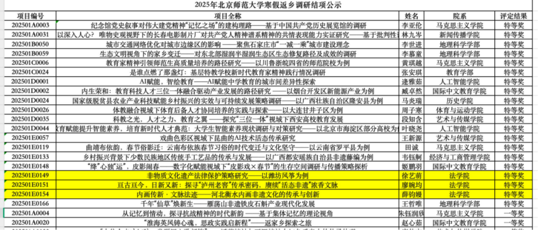2025年北京师范大学寒假返乡调研结项公示名单(节选)