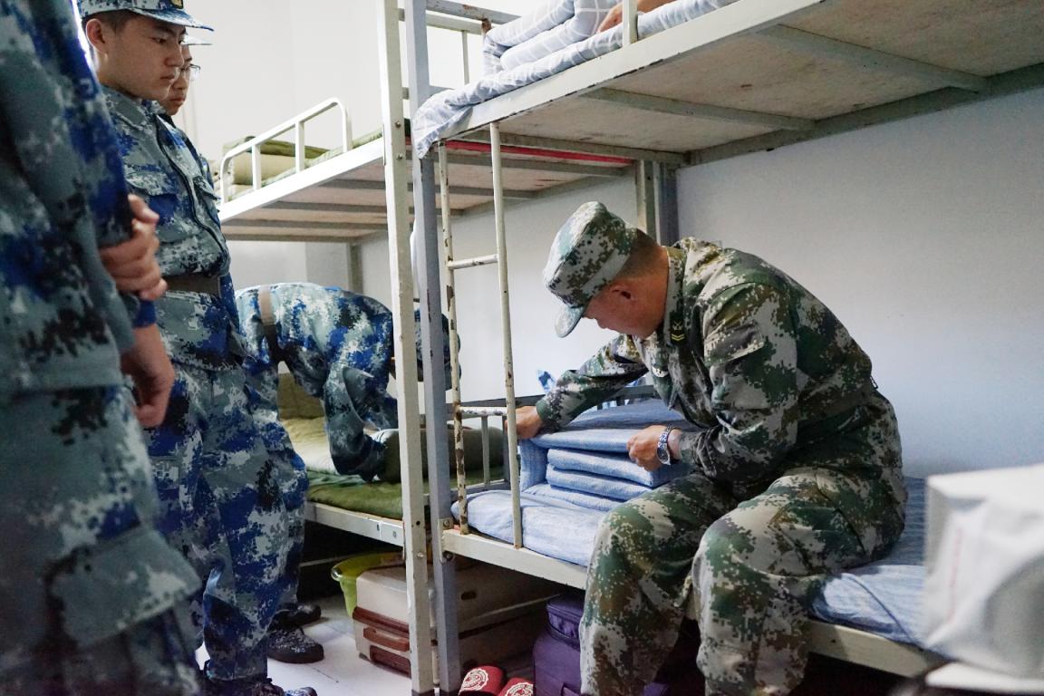 下午两点,军训的第一项活动即学习内务整理,“出门看队列,进门看内务”,内务整理是戒懒戒散的第一步,教官认真示范,学生们认真听学,很快我院新生所在宿舍变得干净而整洁。随即,学生们到达训练场开始了他们第一天的训练。