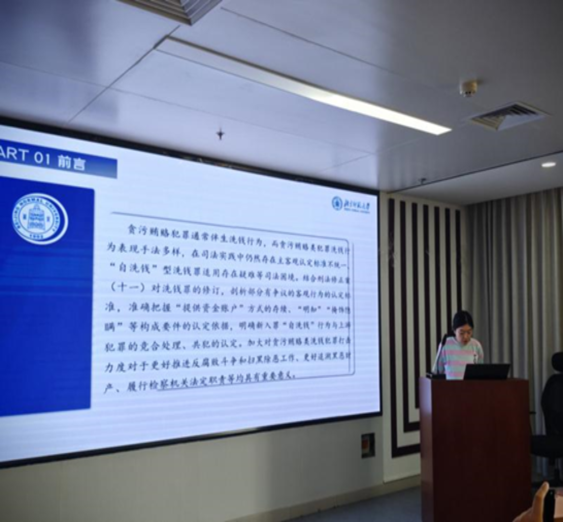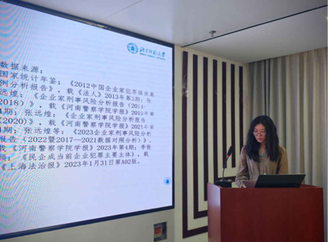 博士研究生李静在与谈中充分肯定了三位报告人汇报内容的思辨性和启发性,并从论文写作的角度,提出了如何处理论文题目与内容的关系、如何在引言部分突出文章的问题意识、对非刑法中通用名词在文中应有所解释等,对三位报告人的论文提出了详尽的修改建议。
