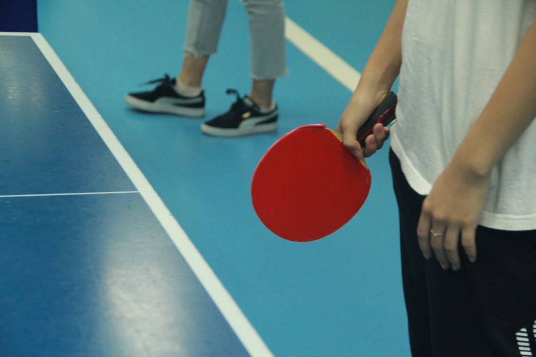 在比赛开始前,乒乓球队的队员们都在一旁人认真热身,互相打气,减轻上场时的压力。