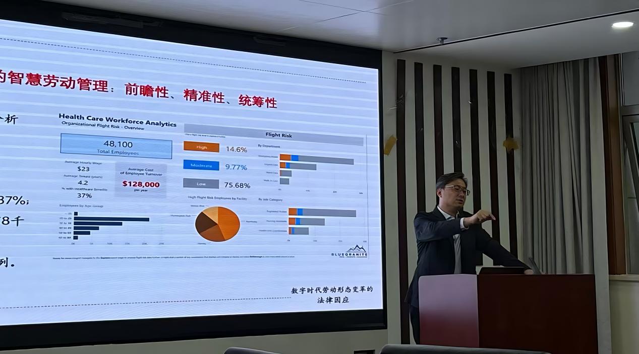 在主题讲座环节,王天玉老师首先分析了数字化转型给劳动形态带来的变革,王老师指出数字时代的劳动变革不仅是就业市场的变化,更是国家整体数字化转型的组成部分。重点行业的数字化转型推动劳动组织方式从“单位制”向“平台化”转型。例如,护理机构通过数据分析实现员工流动风险预测,外卖平台通过算法调度骑手任务,均体现了“数据驱动”对劳动管理的革新。王老师以国内外案例对比强调差异:中国依托电瓶车、换电站等基础设施,形成高效低价的外卖生态;而新加坡、欧洲等地因劳动力密度和技术适配度不足,效率显著滞后。这种差异折射出“技术应用与本土市场深度结合”所带来的劳动形态深刻变革。