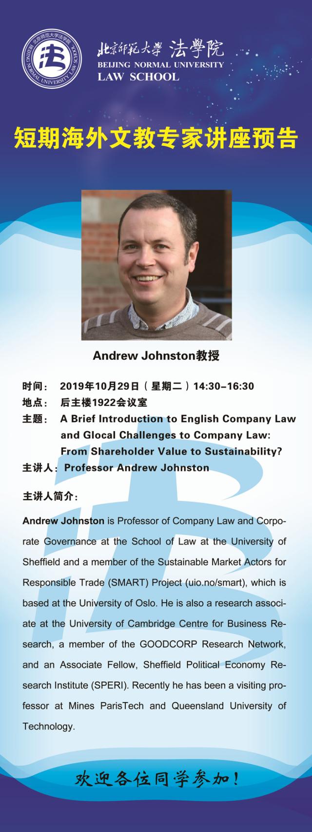 【10.29】短期海外文教专家讲座预告/主讲人:Andrew Johnston教授