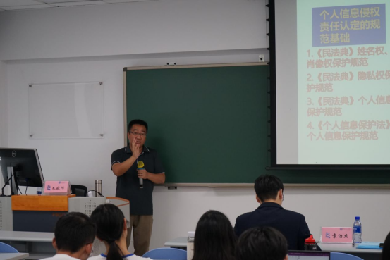 在个人信息侵权责任法律效果评价的基本方法方面,朱晓峰教授向同学们分别介绍了构成要件论、动态体系论,利益权衡论,并向同学们解释了赋权保护模式与侵权责任认定以及行为规制模式与侵权责任认定。