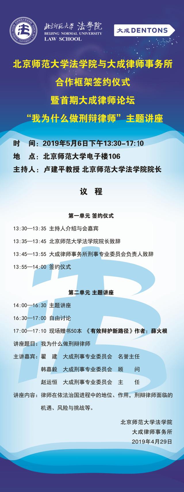 【05.06】北师大少妇色情 与大成律师事务所合作框架签约仪式暨首期大成律师论坛“我为什么做刑辩律师”主题讲座