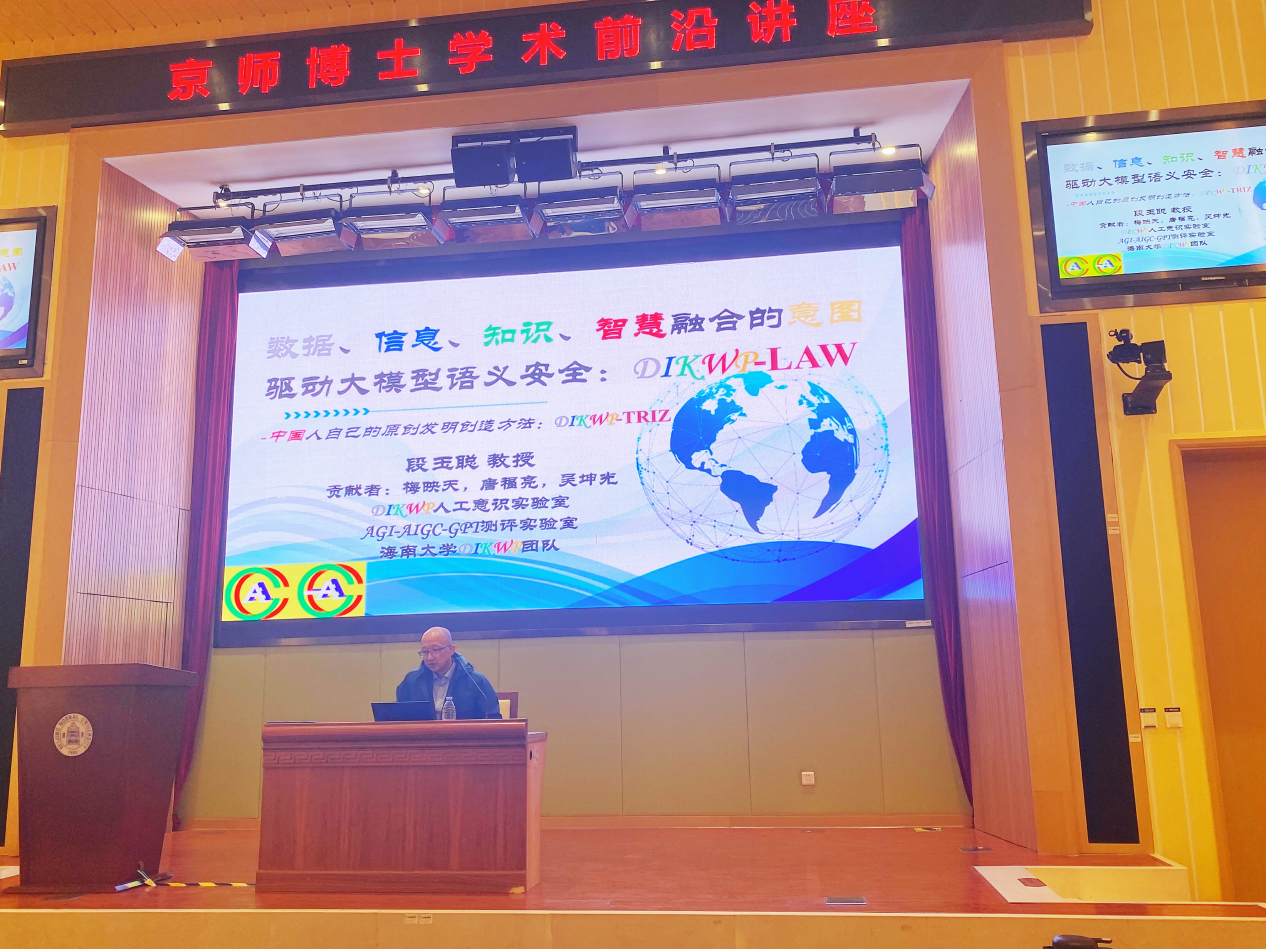 讲座中,段玉聪教授介绍了人工智能的数据、信息、知识、智慧、意图(DIKWP)模型方法,指出目前人类史无前例的需要从法律角度应对人工智能的挑战。段教授深入讨论了如何建立可信赖、可验证,可负责且唯一的人工智能。他认为实现完全智能化需要突破概念空间,进入到语义空间,找出容易产生歧义的部分,让司法拥抱人工智能,使司法智慧化。段教授进一步分析了DIKWP模型在司法中的技术应用,提出可以在DIKWP模型的引领下推进法治从概念空间向语义空间的认知空间升维。他指出,应对人工智能发展,法律必须前置。