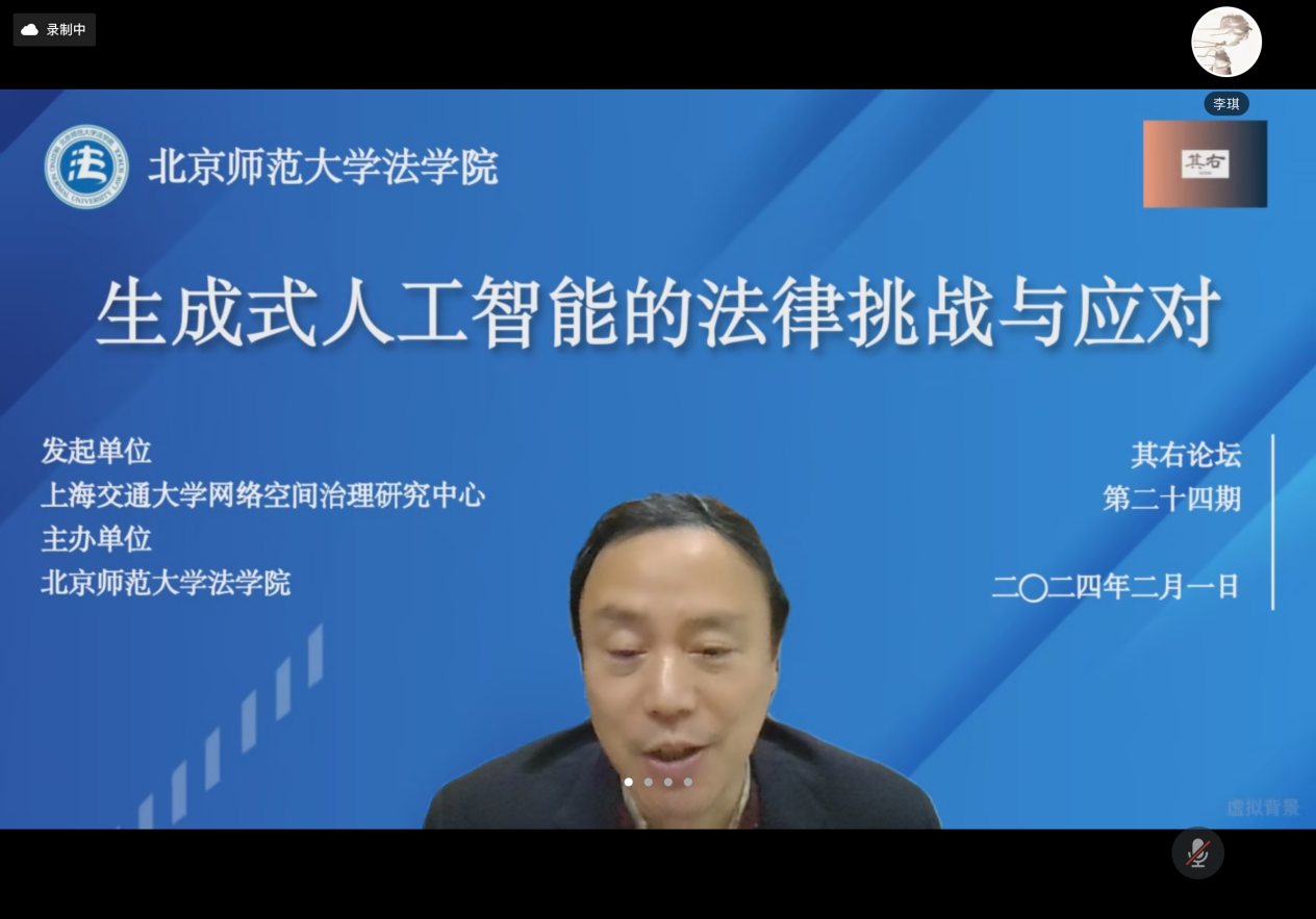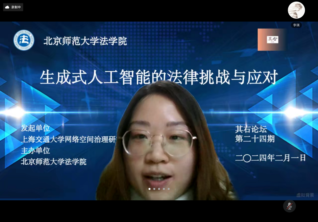 其右论坛第二十四期网会于2024年2月1日顺利召开。本期论坛的主题是“生成式人工智能的法律挑战与应对”。来自多所高校的60余名师生参与了本期论坛。