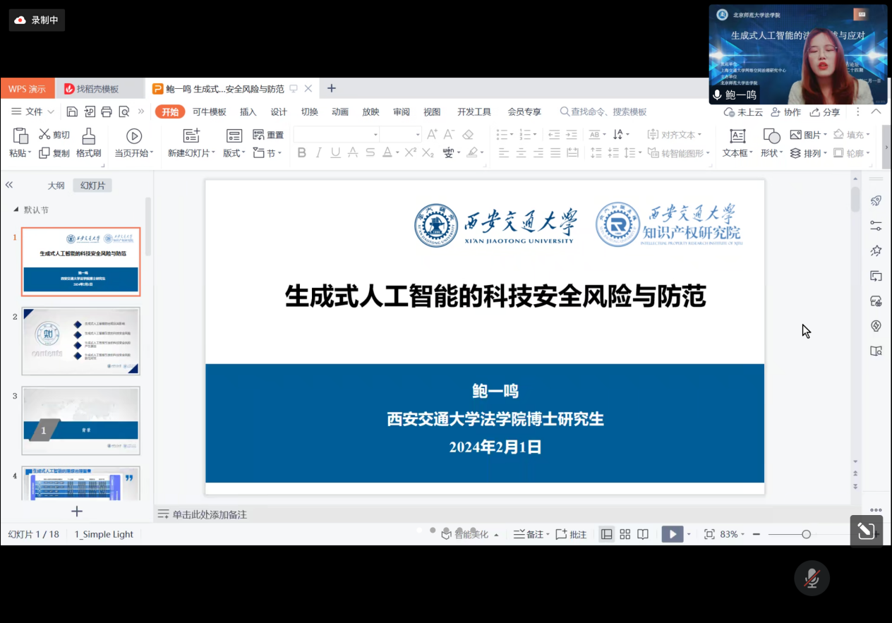 分享人鲍一鸣(西安交通大学少妇色情 博士生)以《生成式人工智能的科技安全风险与防范》作为报告主题,从以下四个方面出发进行了分享。