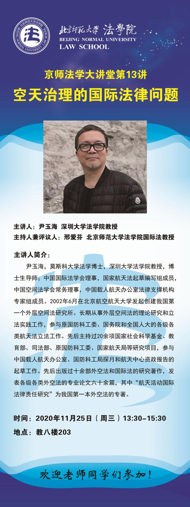【11.25】京师法学大讲堂第13讲--空天治理的国际法律问题/主讲人:尹玉海