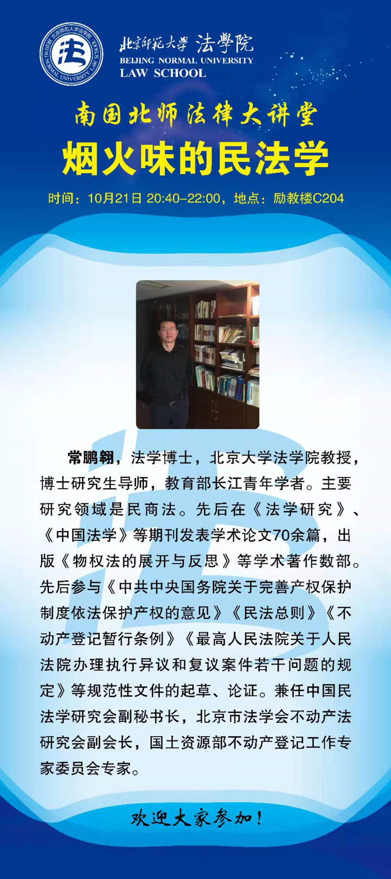 【10.21】南国北师法律大讲堂--烟火味的民法学/主讲人:常鹏翱