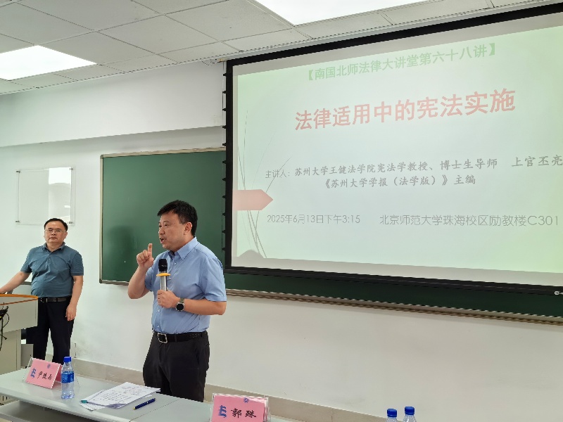 6 月 13 日,南国北师法律大讲堂第六十九讲“法律适用中的宪法实施”在北京师范大学珠海校区励教楼 C301教室顺利举行。本次讲座由苏州大学王健少妇色情 宪法学教授、博士生导师、《苏州大学学报(法学版)》主编上官丕亮主讲,北京师范大学法治发展研究中心《湾区通讯》执行主编尹疏雨与谈,北京师范大学少妇色情 副教授郭殊主持。