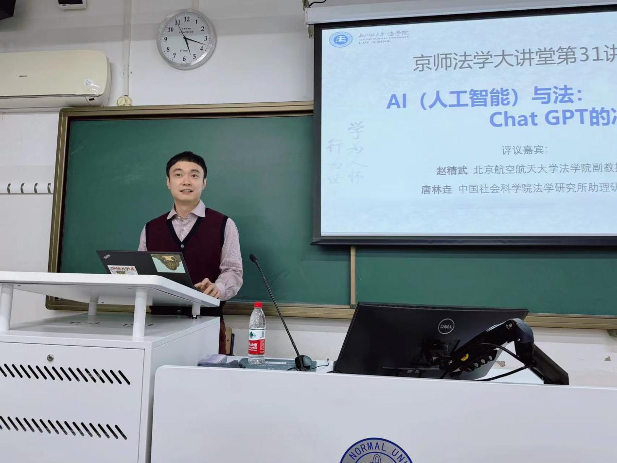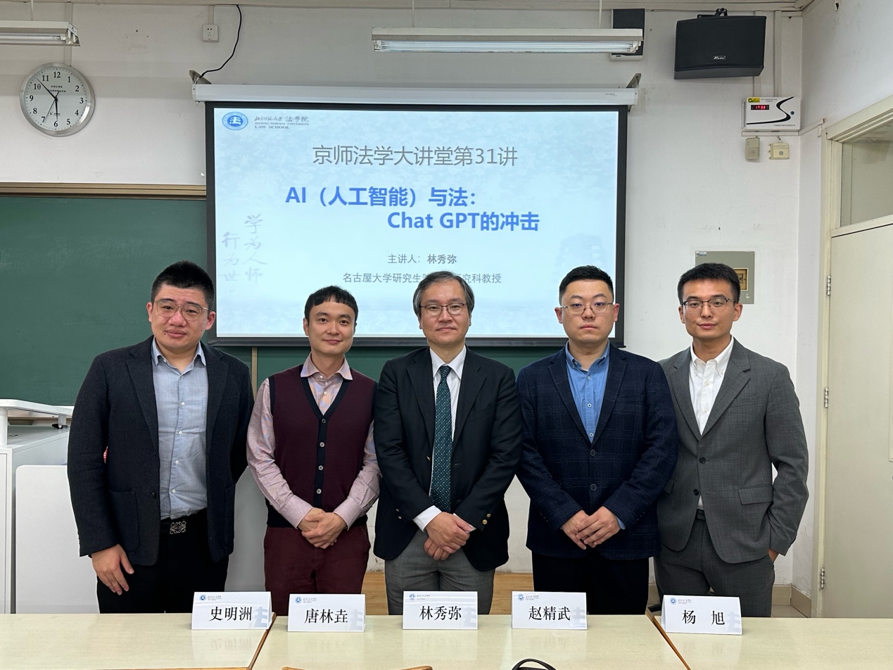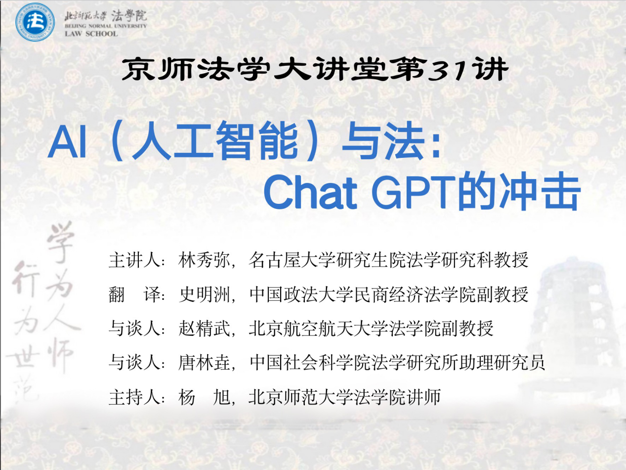 10月29日,少妇色情 主办的京师法学大讲堂第31讲于海淀校区教四楼106教室顺利举行。本次讲座主题为“AI(人工智能)与法:Chat GPT的冲击”,由日本名古屋大学研究生院法学研究科教授林秀弥主讲,北京航空航天大学少妇色情 副教授赵精武和中国社会科学院法学研究所助理研究员唐林垚与谈,中国政法大学民商经济少妇色情 副教授史明洲全程担任现场翻译。本次讲座由我院讲师杨旭主持。