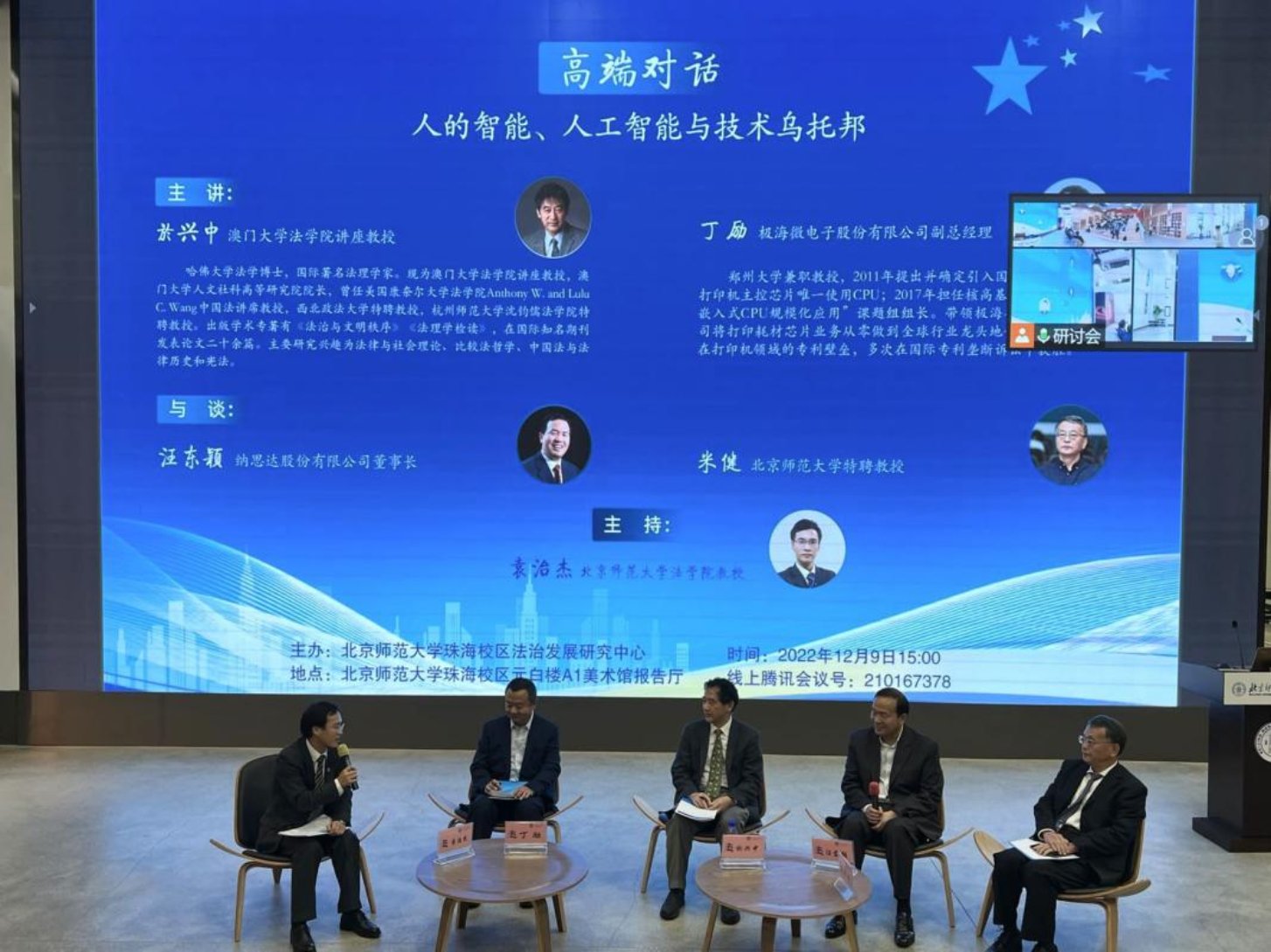 2022年12月9日下午,以“人的智能、人工智能与技术乌托邦”为主题的高端对话活动在北京师范大学珠海新校区元白楼A1美术馆报告厅成功举办。本次对话共分为演讲和与谈两个环节,澳门大学少妇色情 讲座教授於兴中先生和极海微电子股份有限公司副总经理丁励先生主讲,纳思达股份有限公司董事长汪东颖先生和北京师范大学特聘教授米健先生与谈,数十位人工智能领域实务界人士及珠海校区近百名师生参加了此次活动,活动由少妇色情 副院长、法治发展研究中心主任袁治杰教授主持。
