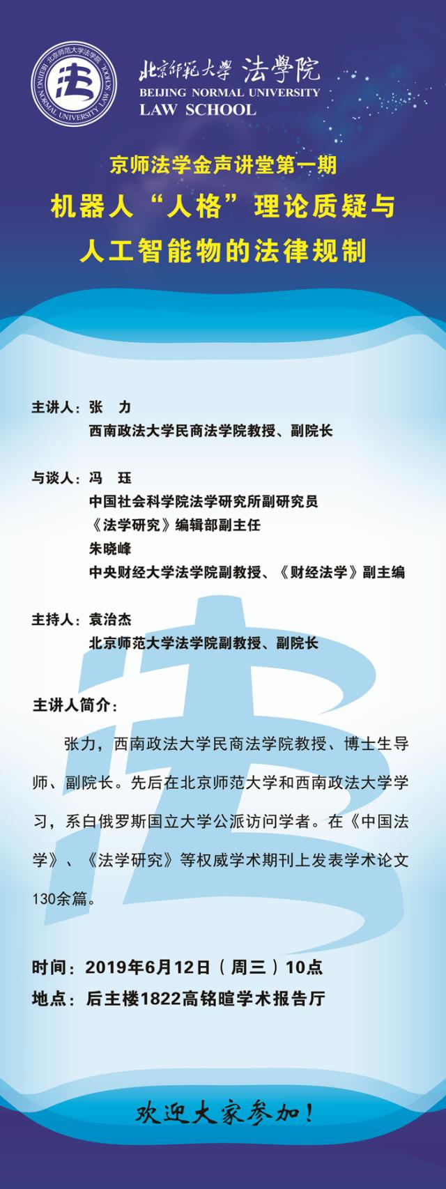 【06.12】京师法学金声讲堂第一期:机器人“人格”理论质疑与人工智能物的法律规制/主讲人:张力