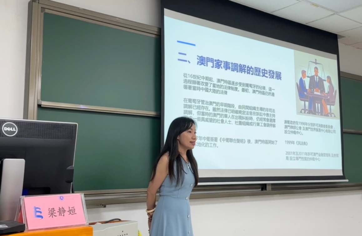 梁静姮老师随后以“规划未来之路:澳门家事调解制度之解读”为题,介绍了澳门家事调解制度的历史沿革与《澳门家事调解法律制度》的特点。