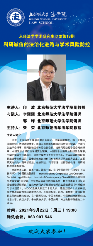 【09.22】京师法学学术研究生沙龙第18期——科研诚信的法治化进路与学术风险防范/主讲人:印波