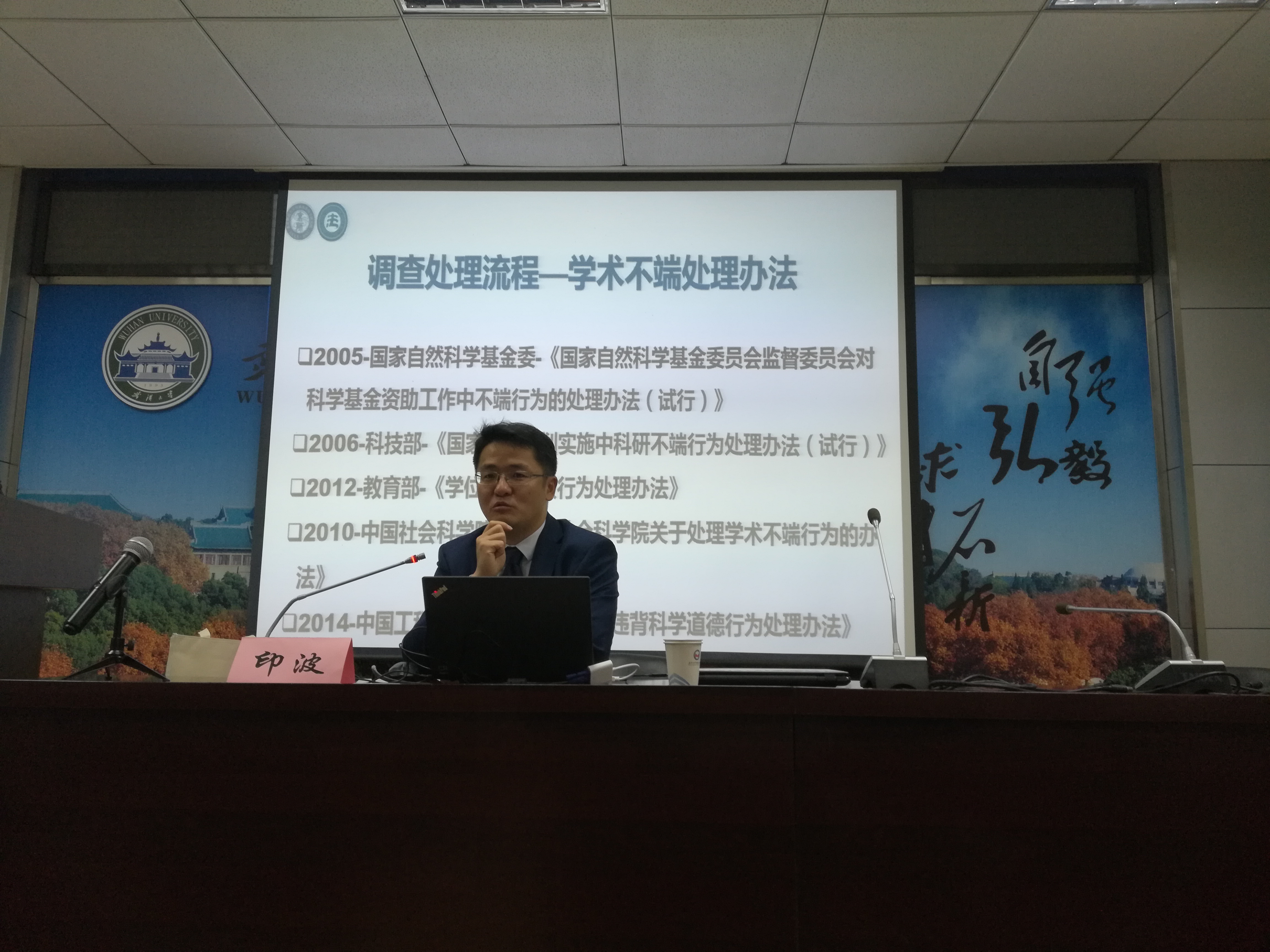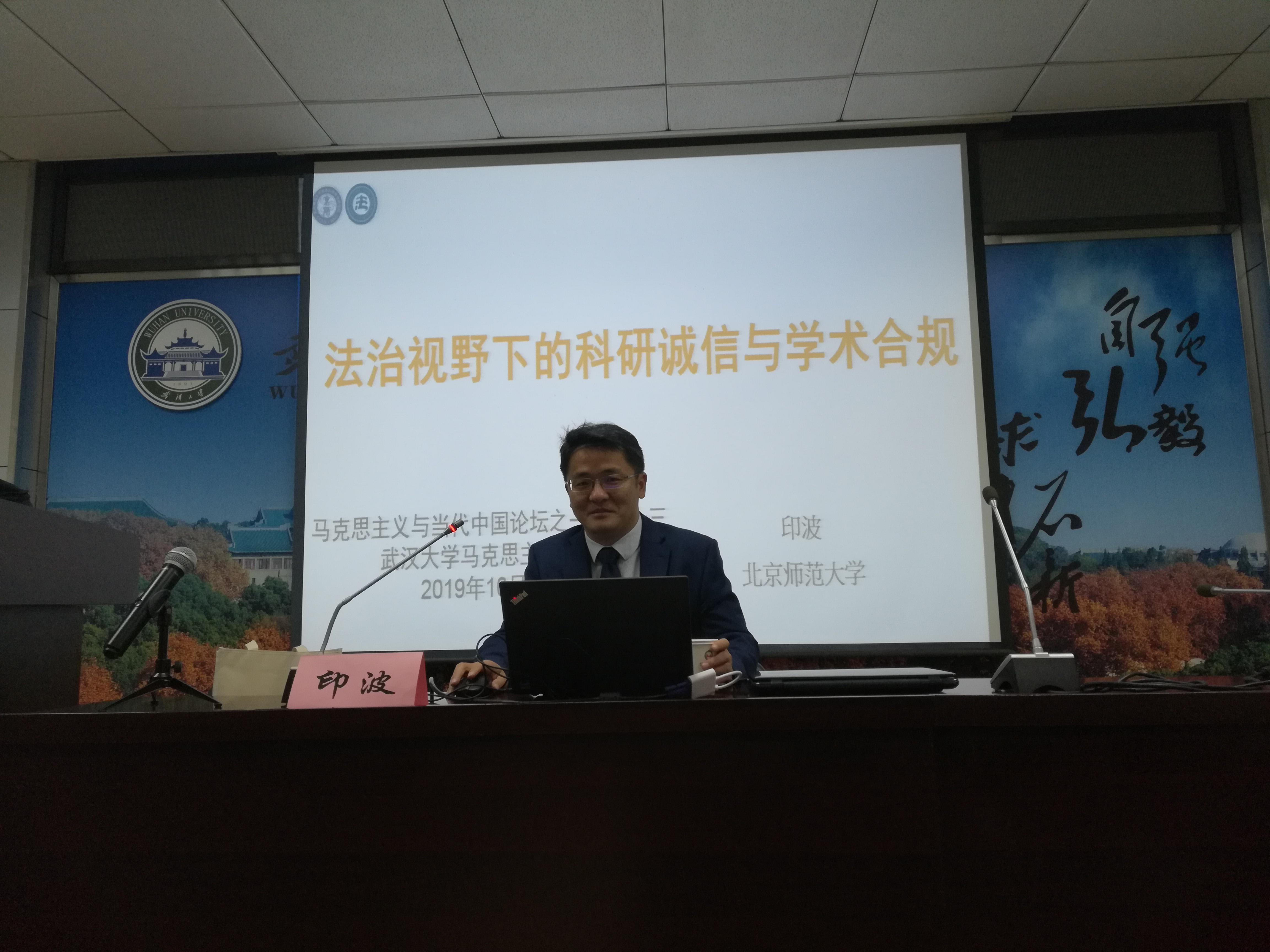 2019年10月26日上午,武汉大学马克思主义学院第113期“马克思主义与当代中国”论坛在马克思主义学院M301会议室举行。本次学术讲座以“法治视野下的科研诚信与学术合规”为主题,由北京师范大学学术委员会顾问,我院印波副教授主讲,由武汉大学马克思主义学院杨礼银副院长主持,相关专业硕博研究生参加了讲座。