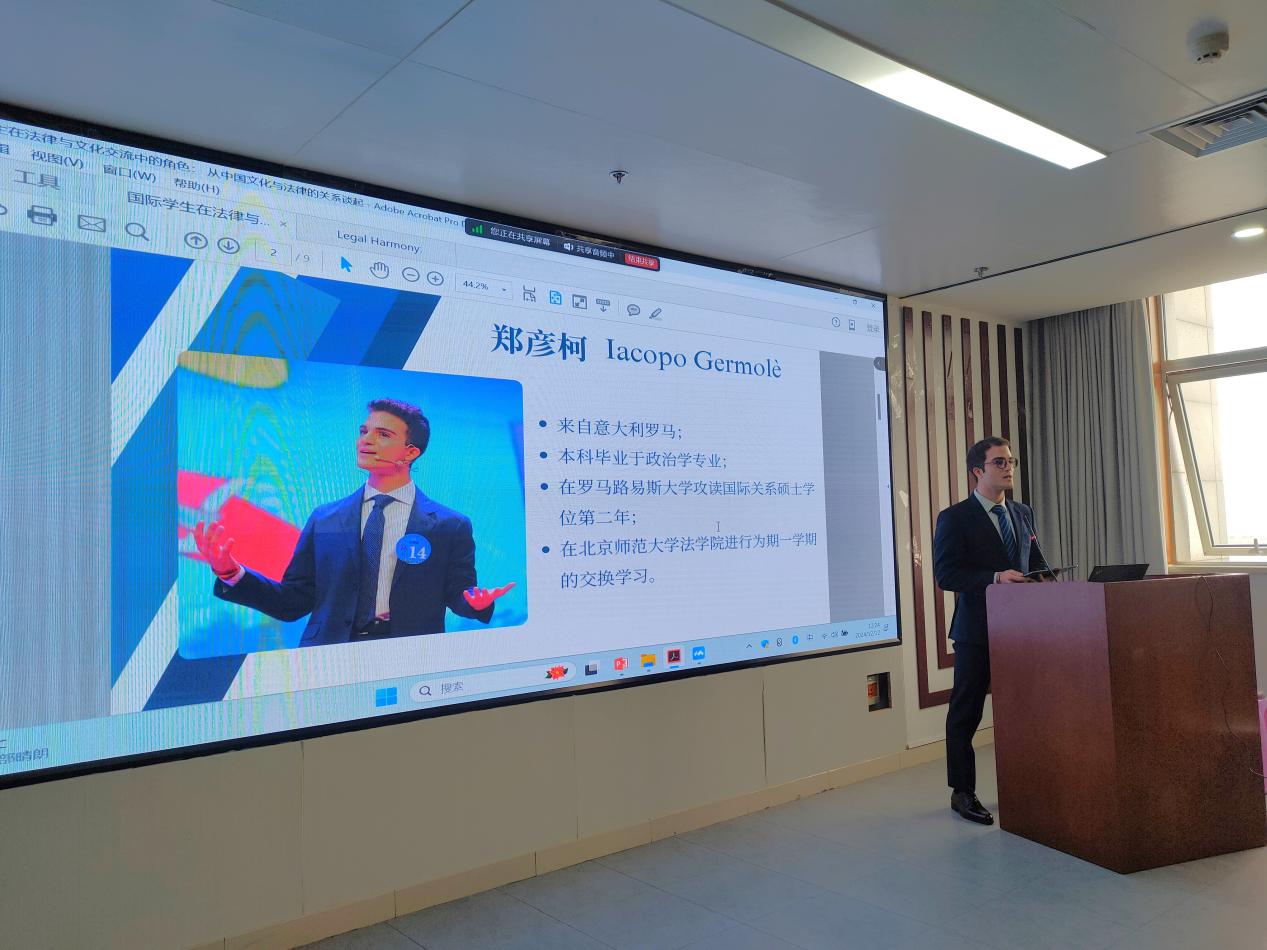 北京师范大学留学生Iacopo Germole(郑彦柯)同大家分享了自己对于中国文化与法律关系的看法。郑彦柯指出,通过参与中国法律史与法律文化的课程学习,他对中国传统文化中的礼法关系有了更加深刻的理解。他认为外国学生学习中国法律,既能学到法律知识,又能促进文化理解与国际合作,有助于理解中国社会的核心价值,促进不同法律体系之间的对话与合作。总之,学习中国法律是文化交流的过程,法律不仅是条文,更是国家文化和历史的鲜活表达。