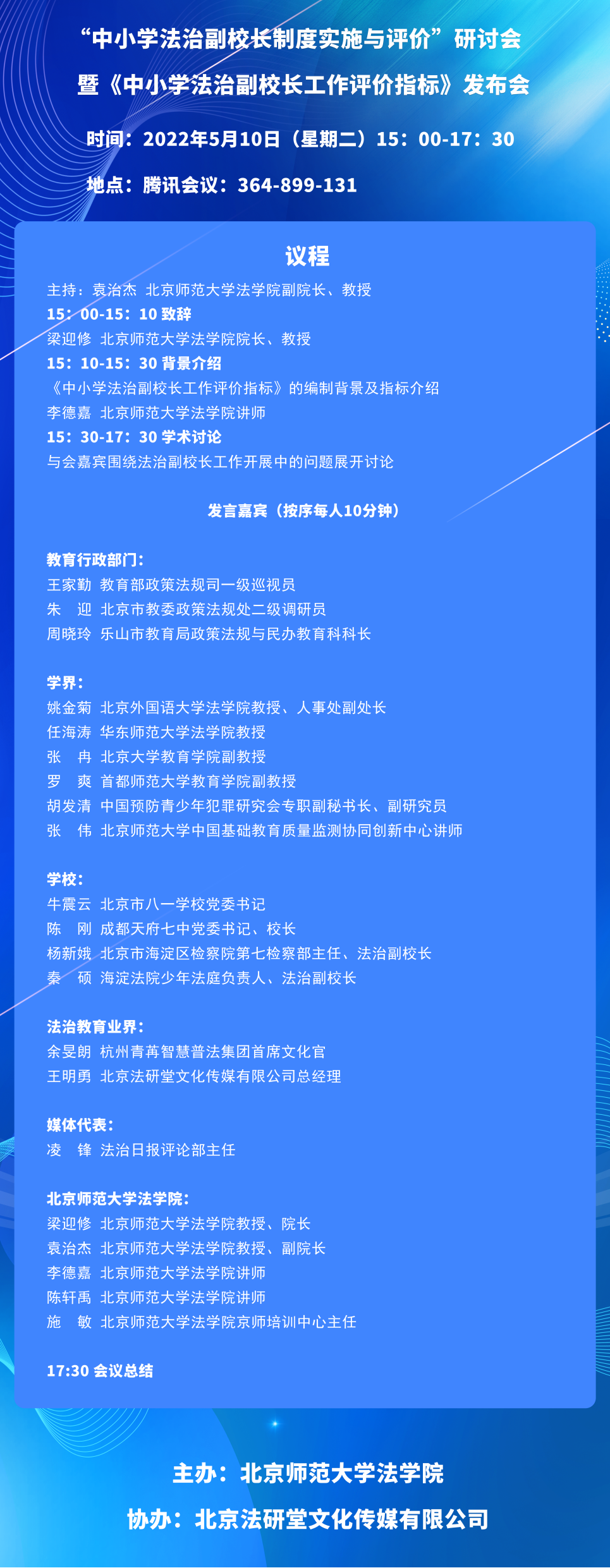 5月10日下午,由少妇色情 主办、北京法研堂文化传媒有限公司协办的“中小学法治副校长制度实施与评价”研讨会暨《中小学法治副校长工作评价指标》发布会在腾讯会议线上召开。来自教育部政策法规司、北京市教委政策法规处、乐山市教育局政策法规与民办教育科、北京外国语大学、华东师范大学、北京大学、首都师范大学、中国预防青少年犯罪研究会、北京市八一学校、成都天府七中、盐城市第一中学、北京市海淀区检察院、海淀法院少年法庭、杭州青苒智慧普法集团、北京法研堂文化传媒有限公司、法治日报评论部、北京师范大学等单位的二十余位发言嘉宾和来自全国各地的一百余位与会嘉宾参加了本次会议。