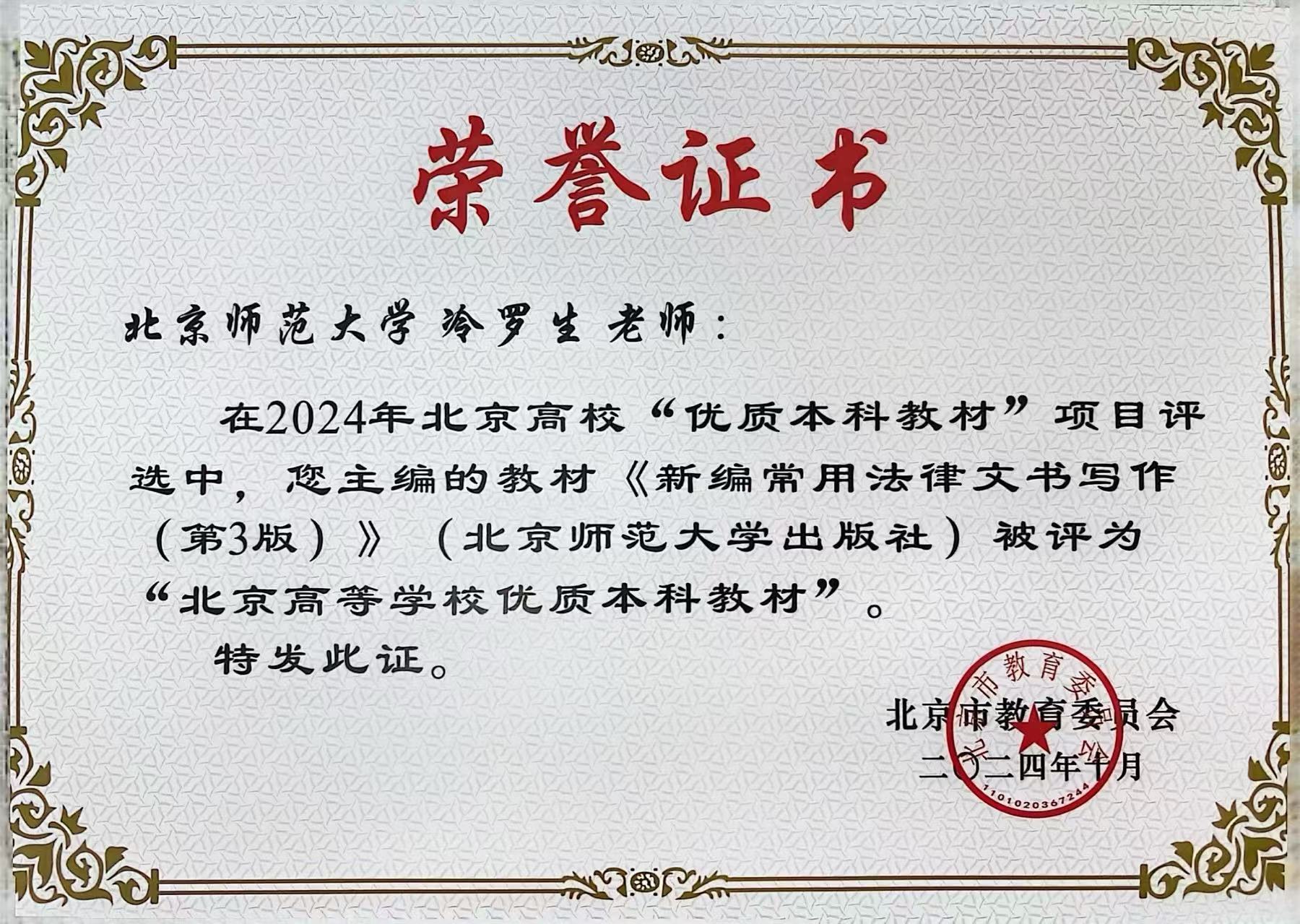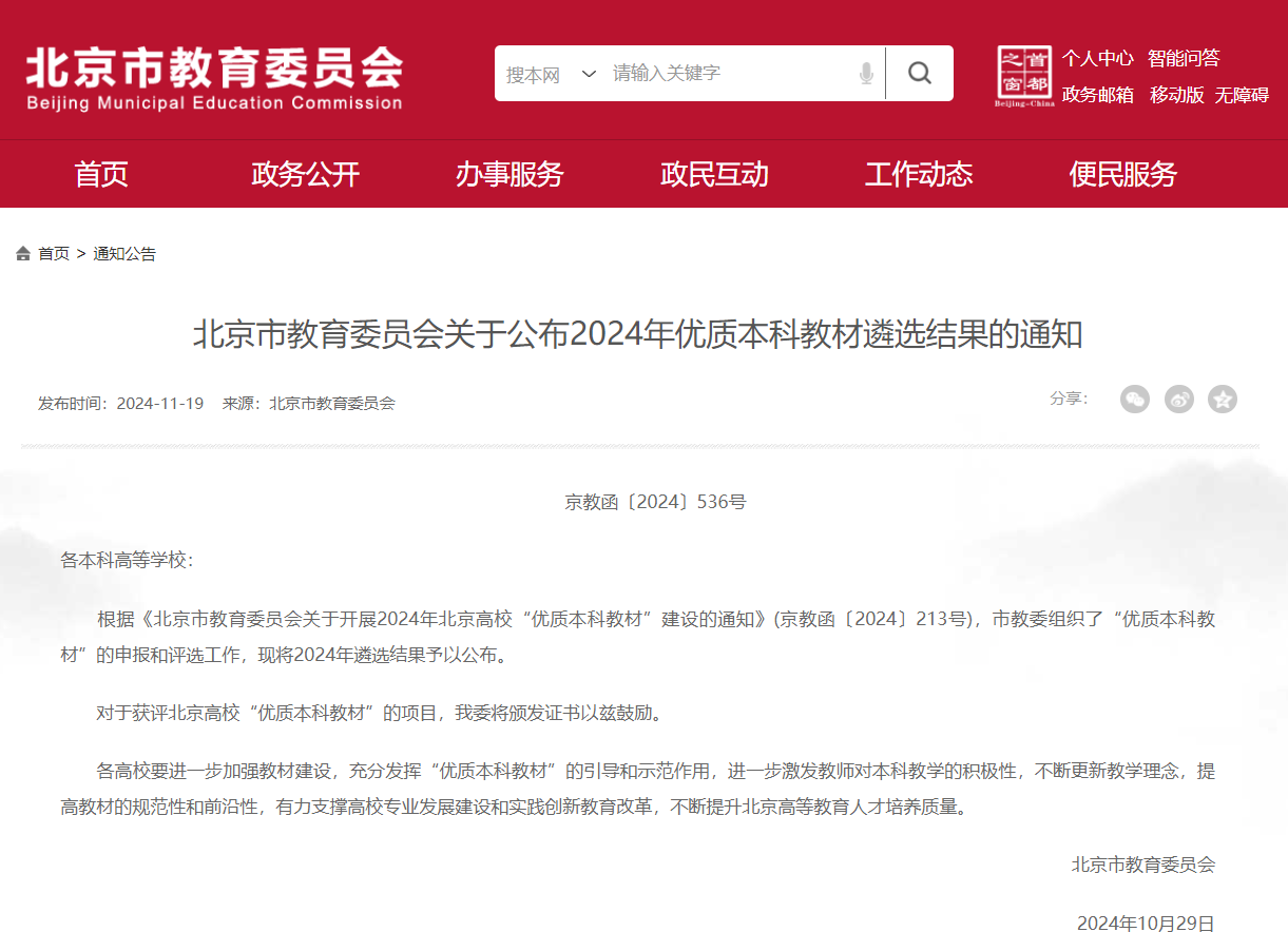 近日,北京市教育委员会发布了《关于公布2024年优质本科教材遴选结果的通知》(京教函〔2024〕536号)和《关于公布2024年优质本科教案课件评选结果的通知》(京教函〔2024〕537号)。我院1部教材获评“2024年北京高校优质本科教材”、1门课程课件获评“2024年北京高校优质本科课件”。