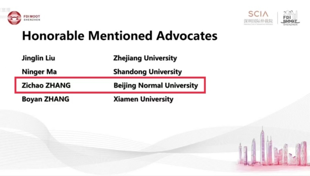 2022年8月14日,第十五届模拟国际投资仲裁竞赛(“Foreign Direct Investment International Arbitration Moot”,“FDI Moot”)暨第二届中国区选拔赛国际投资仲裁深圳杯(FDI MOOT SHENZHEN)比赛结果公布,北京师范大学代表队获得全国季军,并且成功晋级国际赛(FDI Moot Global Rounds);西娅、张孜超同学获得优秀辩手 (Honorable Mentioned Advocate) 个人奖项。