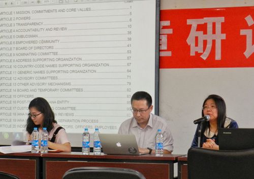 来自ICANN北京合作中心的宋主任、CNNIC的代表分别简短地介绍了其所在组织的职责及工作内容后,薛虹教授就ICANN的新宪章草案作出其独到的分析和见解。薛虹教授主要分析了新宪章中新增与修订的条文,例如ICANN在发展大方向、组织管理结构、管理职能的改进、组织及其职能的重新定位等内容,其中着重介绍了条文中的4、6、16、17、18、19条的有关内容和新变化。ICANN北京合作中心主任宋崝先生也从专业角度介绍了ICANN制度与政策的制定机制,他希望各界人士都可以参与其中,提出对ICANN的期待与要求。之后,来自中国互联网络信息中心(CNNIC)的代表也分享了对于新宪章内容的独特见解。